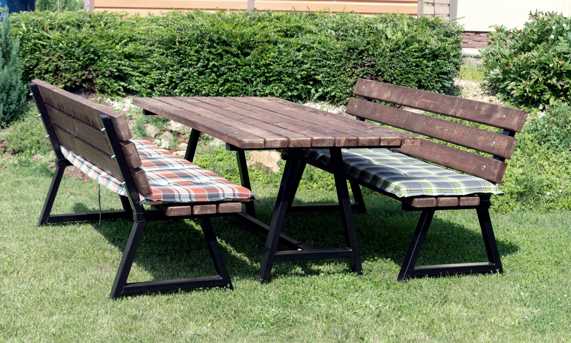 A szerkezete 60X40-es zártszelvényből készült,(nem öntvény, nem törik, színe: grafitszürke). A garnitúra elemeinek teljes hossza 2 méter. A rajta lévő fenyő 4, 5 cm vastag, ami ipari lazúrral van kezelve, mahagóni színben (középbarna), De előzetes egyeztetés alapján egyedi színben is állunk rendelkezésére. A Milesi lazúrjai védik a fát a kártevőkkel szemben, valamint UV elleni védelemmel vannak ellátva a hosszan tartó színhatásért. A viaszos hatása pedig a vízvédelmet nyújtja a faanyag számára. Ez nem lapra szerelt, összecsapolós, külföldről rendelt gagyi kerti bútor, hanem strapabíró, extrém tartós darab, amit az egyszerűség és kényelem jellemez.